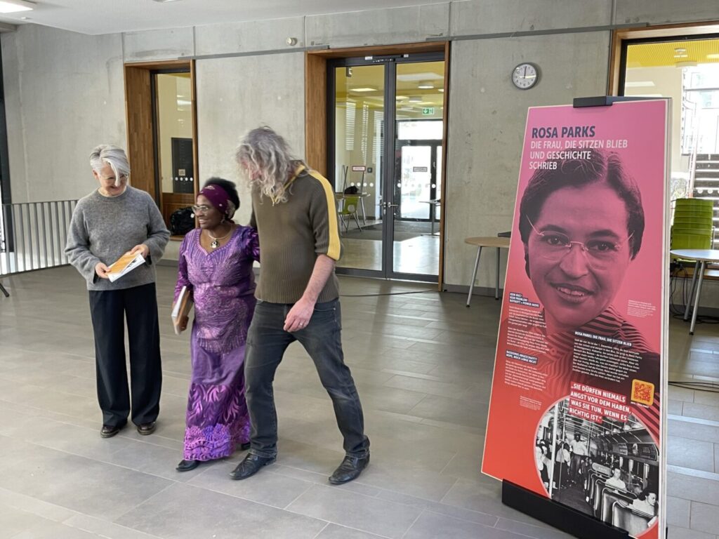 Die Schülerinnen und Schüler der Klassen 11D und 11E bekamen von Herrn Fichtner, verantwortlich bei der Stadt Erlangen, und unserer Schulpatin Frau Dr. Herzberger-Fofana eine Einführung in die Ausstellung, die nun zwei Wochen bei uns am Ohm in der Aula zu besichtigen ist, auch öffentlich zugänglich am Nachmittag. Beide betonten, wie wichtig es ist, die Geschichte des Kolonialismus mitzudenken, wenn man auf Afrika und Menschen afrikanischer Herkunft blickt. Dazu wird die Ausstellung sicherlich beitragen, wenn viele hundert Jugendliche sie am Ohm in den nächsten Tagen besichtigen werden.
